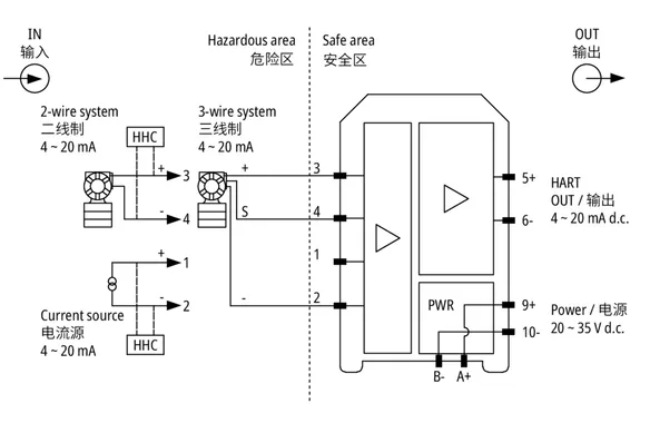 | 电源电压 | 20-35 V DC,功耗 ≤ 95 mA(在 24 V DC 供电电压和 20 mA 变送器输入/输出时) |