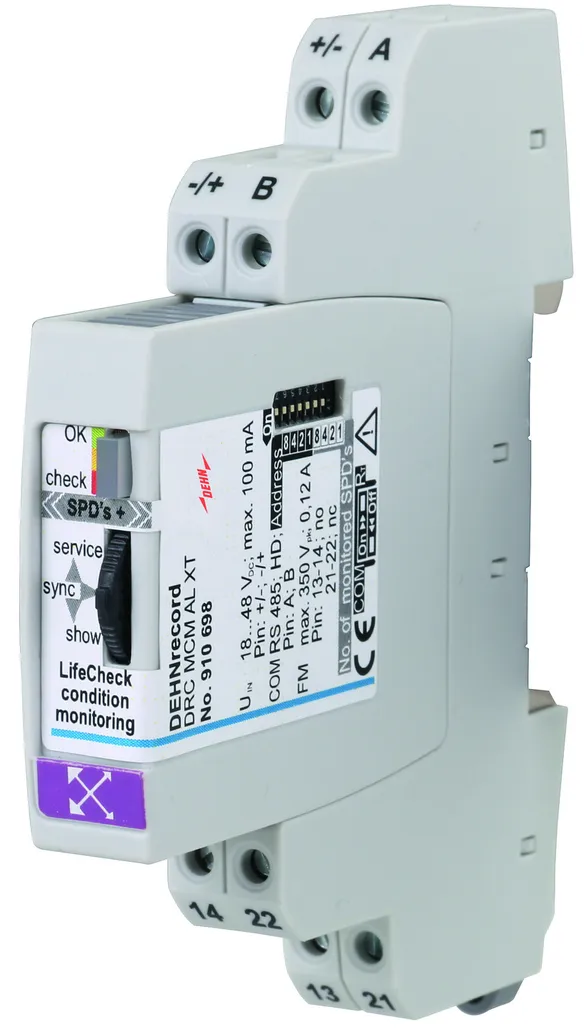 紧凑型DIN轨安装的状态监测装置,内置LifeCheck传感器,最多可监测10个内置LifeCheck的BXT电涌保护器。传输BXT电涌保护器的产品状态,总线地址及产品货号至通讯模块DEHNrecord Alert。