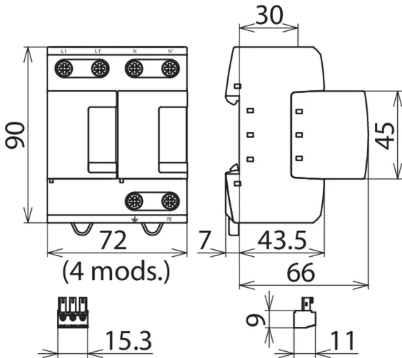 | 电压保护水平 [L-PE]/[N-PE] (UP ) | ≤ 1.5 / ≤ 1.5 kV |