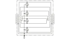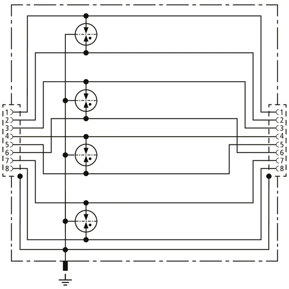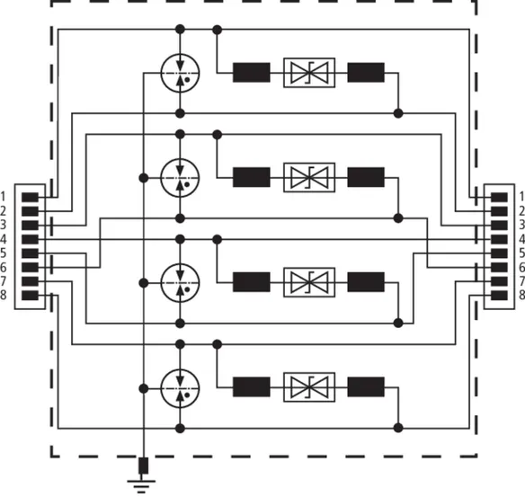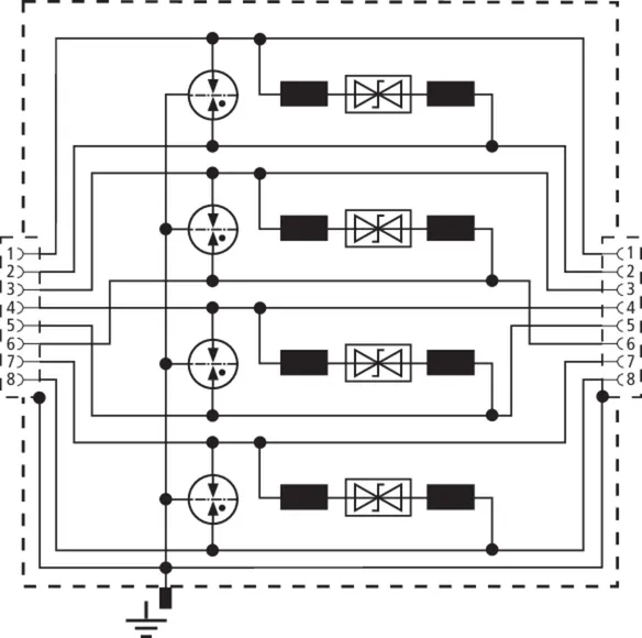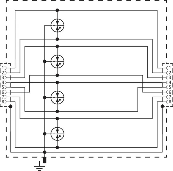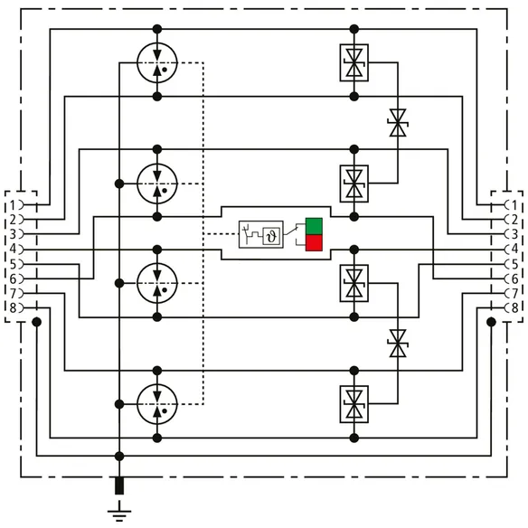 节省空间的,通用复合型雷电流与电涌保护器,采用RJ45连接技术,宽度19mm,集成状态指示功能,易于维护。用于保护工业以太网,数据服务器,IP摄像机系统,满足PoE供电 (IEEE 802.3 兼容 4PPoE)及与之相似的符合Class EA类要求,并可满足高达500 MHz的结构化布线系统,以及基于一般以太网接口各种应用。使用气体放电管保护所有线对。带RJ45插座,用于DIN轨安装。通过强大的气体放电管和信号芯线及线对间的二极管保护所有线对。 全屏蔽适配器设计,带有 RJ45 插座,用于 DIN 导轨安装。 外壳上有额外的螺钉连接,可用于的接地等电位连接。