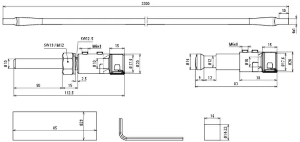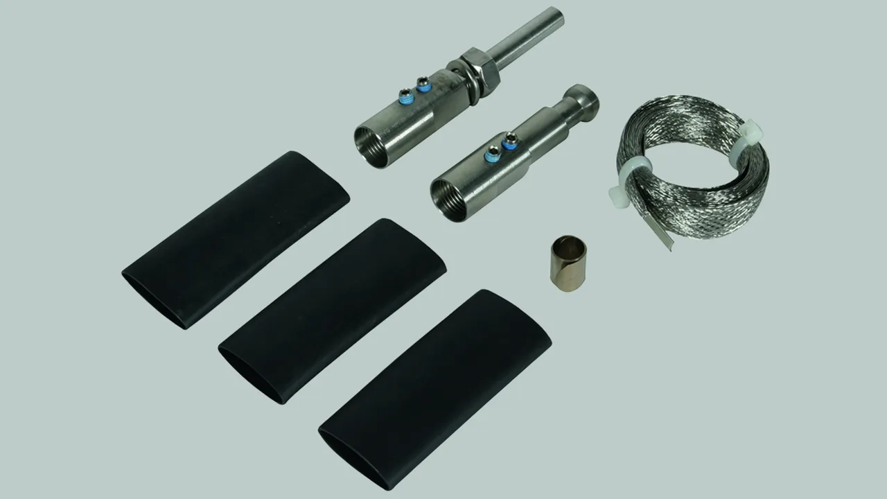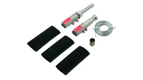 Fixing elements for DEHNcon-H, HVI light Conductors Connection kit for sealing both ends of the HVI-light Conductor, for establishing the adjustment range of the conductor in the supporting tube (head piece) and connection element for connection to other parts of the external lightning protection or earth-termination system (including EB connecting cable, constant force spring and three heat shrinkable sleeves)